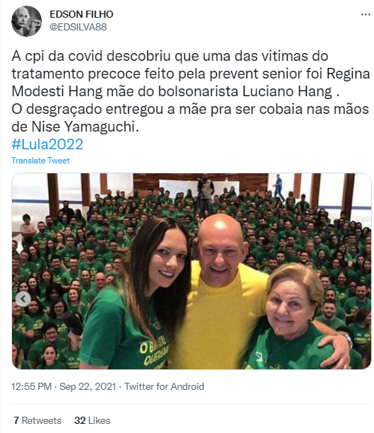 Mas não foi só isso que descobrimos hoje. A mãe do empresário Luciano Hang morreu em fevereiro, também de covid . Assim como Wong, Regina Hang também foi tratada em hospital da Prevent Senior. Também foi submetida ao “tratamento precoce”. E, ao morrer de covid, também teve a certidão de óbito fraudada para ocultar a covid.