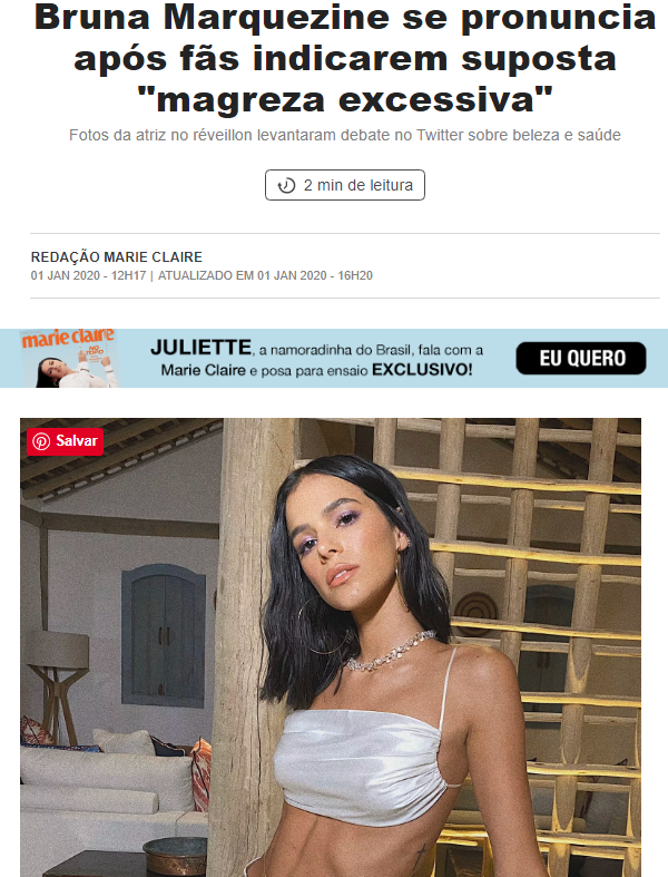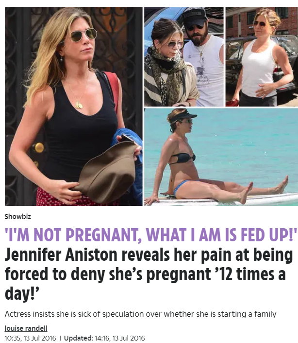 Esse escrutínio constante do corpo das mulheres levou Jennifer Aniston a explodir em 2017, farta de que toda vez que não pulasse o jantar a imprensa lhe atribuísse uma gravidez. Em uma carta aberta ao The Huffington Post, ela declarou: “A objetificação e o escrutínio a que submetemos as mulheres são absurdos e perturbadores. Usamos as notícias das celebridades para perpetuar essa visão desumanizadora da mulher, centrada apenas na aparência física, que os tabloides transformam em evento esportivo de especulação. Me incomoda que me façam sentir menos que porque meu corpo está mudando ou comi um hambúrguer no almoço e me fotografaram de um ângulo estranho e, portanto, me consideraram uma de duas coisas: grávida ou gorda”.