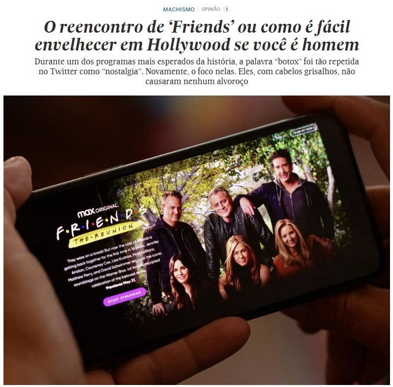Vinte e sete anos depois, cada um desses seis atores, agora celebridades mundiais, embolsou cerca de dois milhões e meio de dólares (13 milhões de reais) por um especial de pouco mais de uma hora e meia. Um montante proporcional ao interesse excessivo gerado por tudo o que se relaciona com Friends, a série que definiu as linhas a serem seguidas pelas sitcoms que vieram depois. Um legado brilhante na criação, mas que deixa sombras no debate sobre idades, corpos e sexos.