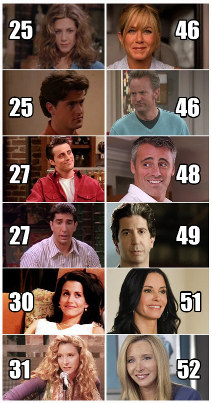 As mudanças na aparência dos protagonistas são tão lógicas como evidentes, mas nos causam estupor porque em nossa memória Monica, Ross, Rachel, Joey, Phoebe e Chandler não envelheceram nem um dia desde que fecharam a porta de seu icônico apartamento no Village. Talvez porque aquele apartamento tenha permanecido perene nas reprises contínuas e, agora, nas plataformas de streaming (em troca de cifras milionárias). Mas Jennifer Aniston, Courteney Cox, Lisa Kudrow, David Schwimmer, Matt LeBlanc e Matthew Perry envelheceram, sim. Dezessete anos, especificamente. E, para muitos, foi um choque descobrir que os jovens na faixa dos 20 anos na televisão se transformaram em pessoas na casa dos 50.