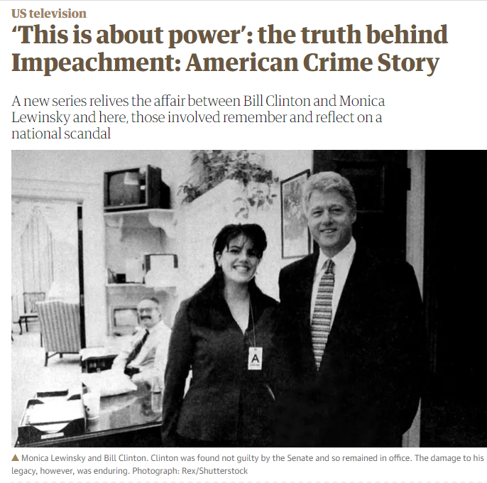 Mas pobre Monica. Sempre tive pena dela. Obviamente ela nunca quis nada daquilo. A Monica de verdade (que é muito mais bonita que Beanie Feldstein, que está ótima) sentiu-se mal ao ver que tinha se tornado uma celebridade com montes de fãs. Na sua noite de autógrafos em Londres, isso fica muito evidente . Quando seu nome se torna conhecido mundialmente, ela é descrita como uma stalker! Ela, uma jovem no seu primeiro emprego, é pintada como uma carente que foi atrás do homem mais poderoso do mundo, tadinho! Fico feliz que ela conseguiu dar a volta por cima, defendeu o movimento MeToo, se tornou uma porta-voz contra bullying e até uma produtora de uma série que também é sobre ela (ela é uma das produtoras de Impeachment).