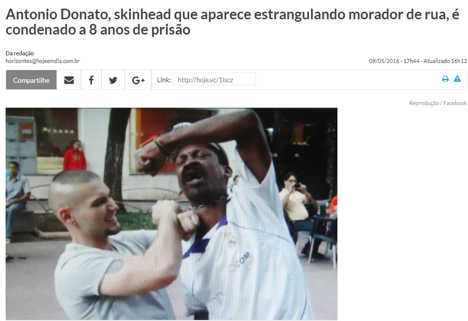E muita gente lembra de 2013, quando foi preso um skinhead que, orgulhoso, postou uma foto enforcando um morador de rua em Belo Horizonte. Mais tarde o covardão foi condenado a 8 anos de prisão. Mas o que mais chamou a atenção foi que a polícia descobriu em sua casa uma carta do então deputado federal Bolsonaro endereçada a ele. O que dizia a carta? Ainda não sabemos. Foi confiscada pela polícia, que nunca divulgou seu conteúdo.