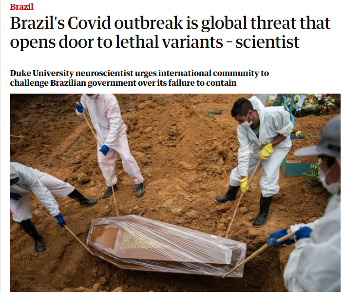 Além disso, Nicolelis adverte que o Brasil é uma ameaça pro mundo, um laboratório a céu aberto para o vírus proliferar, criando mutações ainda mais letais. O planeta inteiro deveria se posicionar contra Bolso, que se tornou o inimigo público número 1 na pandemia.