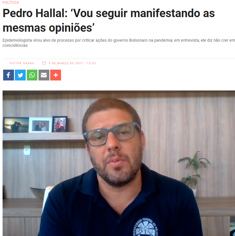 Pedro Hallal, doutor em epidemiologia e ex-reitor da Universidade Federal de Pelotas, um dos dois professores ameaçados com processo administrativo por criticarem Bolsonaro, diz: “Se a gente tivesse que elencar uma única medida que ajudaria a resolver os problemas, é trocar o comando do País. Se a gente tivesse alguém no comando do País que, minimamente, ouvisse a opinião dos pesquisadores, o Brasil jamais teria chegado a mais de 250 mil mortes. Três de cada quatro mortes teriam sido evitadas se o Brasil tivesse um desempenho do enfrentamento à pandemia igual à média mundial. Não estou dizendo ser igual à Nova Zelândia, é se a gente fosse igual a média. Isso dá uma noção da dimensão do quão fracassada é a política do governo Bolsonaro no enfrentamento à pandemia”.