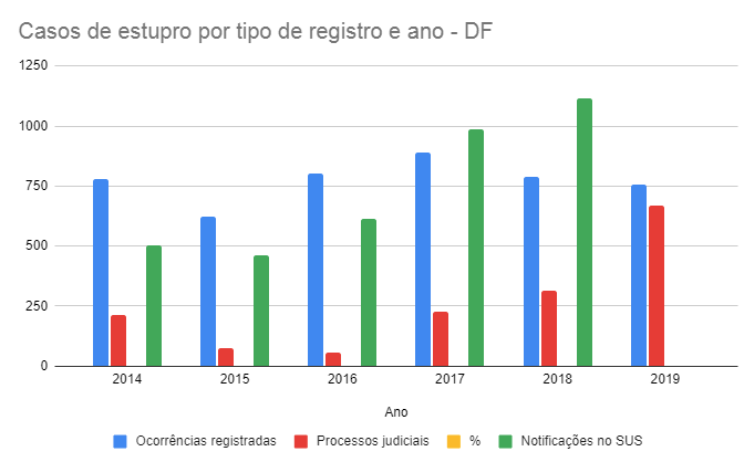 Durante o período analisado, as delegacias do Distrito Federal registraram 8.465 ocorrências de estupro, segundo dados compilados pelo Fórum Brasileiro de Segurança Pública (FBSP). De acordo com o Conselho Nacional de Justiça (CNJ), a Justiça do Distrito Federal registrou 1.554 novas ações criminais por estupro, o que representa 18% ou pouco menos de ⅕ dos casos denunciados nas delegacias.