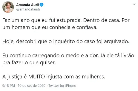 Quanto à denúncia de Amanda, o MPDFT informa que não pode dar muitas informações por conta do segredo de justiça. “Após a conclusão da fase de inquérito policial e da coleta de provas, o MPDFT constatou que os elementos probatórios reunidos no inquérito policial não seriam capazes de sustentar uma condenação em desfavor do acusado. Assim, foi solicitado o arquivamento em 2 de julho de 2020.”