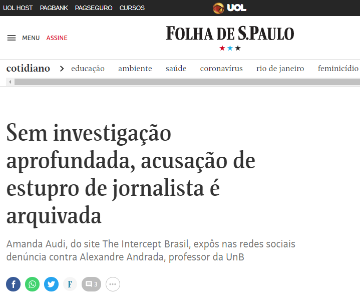 “Muito nos surpreendeu que, na sequência, ele fez uma série de posts no Twitter questionando a reação da Amanda após a violência sofrida; publicou conversas fora de contexto e censuradas, supostamente com pessoas do Intercept; escreveu para a Folha de São Paulo e declarou no próprio artigo que notificou os veículos de comunicação que divulgaram o caso…”, relembra Del Monde. “Ele partiu para uma ofensiva jurisdicional para garantir que qualquer versão da história que não a dele fosse totalmente abafada.”