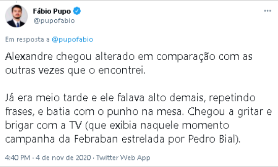 Fábio Pupo: Eu estava aqui em casa com os meus amigos, inclusive a Amanda. A gente estava jogando videogame, pra você ver como estava tranquilo. Daqui a pouco a gente cansou e começou a ver Fantástico. Na chamada, passou alguma matéria curiosa, alguma coisa envolvendo a Amazônia, e a gente quis assistir, só que não passava nunca… Aí a noite foi avançando e o Rafa Moro saiu de casa para encontrar o Alexandre. Ainda com o Rafa Moro fora de casa, tocou o interfone, eu atendi e era o Alexandre. Fiquei surpreso, mas disse que podia subir. Ele chegou em casa muito alterado, acho que é essa a palavra adequada. Ele estava falando muito alto e repetindo as frases. Por exemplo: eu lembro nitidamente de ele ter repetido duas ou três vezes “que honra estar aqui na casa do Fábio Pupo da Folha de São Paulo”. Uma hora eu falei: “Alexandre, tá bom, obrigado, mas você já disse isso, agora vamos mudar de assunto?”. E assim foi… Ele sentou no banco do lado da Amanda. Seguiu falando alto, em alguns momentos bateu na mesa e gritou com a televisão. Mas não era qualquer grito, não, era tipo um berro. Começou a passar uma propaganda da Federação Brasileira de Bancos e ele, economista, gritou com a televisão. “Ah, essa Febraban é uma filha da puta!”. Se não estava claro antes, ficou claro ali que tinha algo muito esquisito.