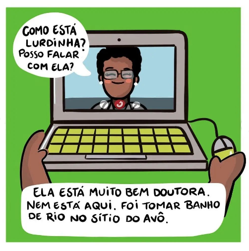 Em uma chamada pelo computador a médica pergunta: Como está Lurdinha? Posso falar com ela? A mãe responde: Ela está muito bem, doutora. Nem está aqui. Foi tomar banho de rio no sítio do avô.
