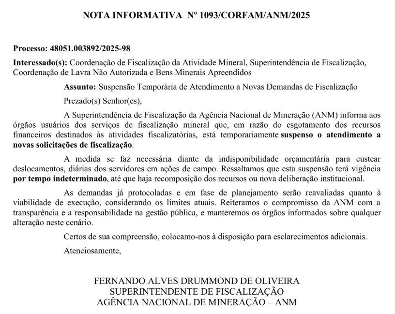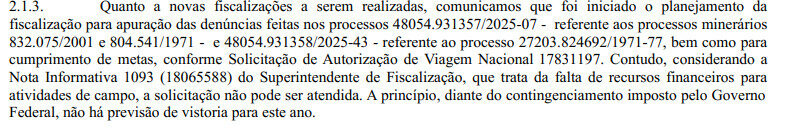 A ANM, porém, informou via LAI que começou um planejamento de fiscalização para apuração das denúncias feitas, mas, por falta de recursos financeiros para atividades de campo, a solicitação ainda não pode ser atendida em 2025. “A princípio, diante do contingenciamento imposto pelo Governo Federal, não há previsão de vistoria para este ano”, diz a ANM.