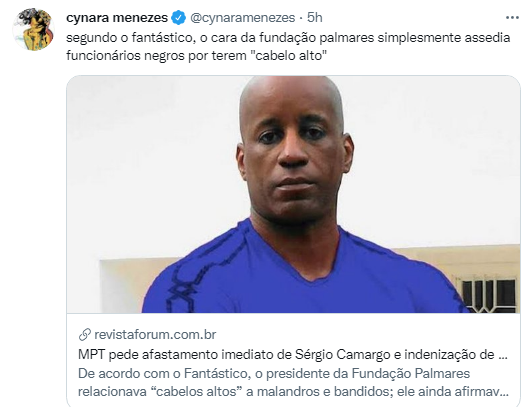 O Fantástico, através do repórter Guilherme Belarmino (nos tornamos amigos depois do Profissão Repórter em 2015), fez uma ótima reportagem mostrando como o presidente da Fundação Palmares, Sérgio Camargo, não faz nada além de perseguir servidores, hostilizar os movimentos negros, e redigir tuítes para lacrar na extrema-direita.