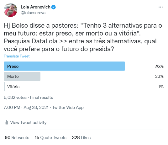 Por isso criei uma pesquisa no Twitter. Mais de cinco mil pessoas da minha bolha vermelha responderam. Elas querem mesmo é que o “presida” usado para abreviar “presidente” seja usado pra descrever “presidiário”.