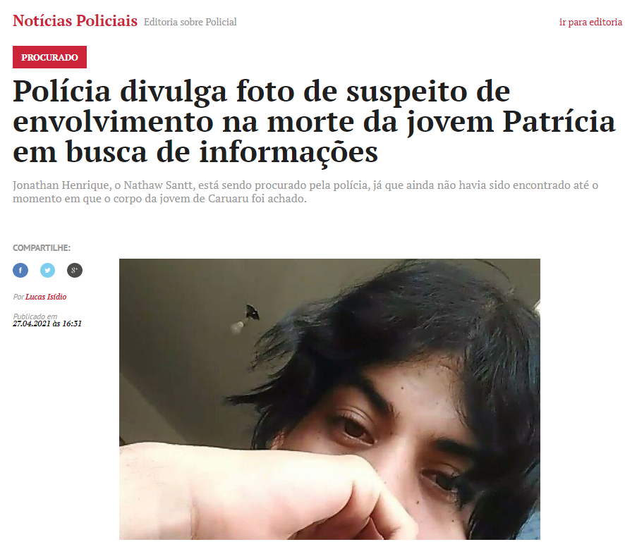 No Twitter, mulheres acostumadas a crimes e massacres cometidos por mascus já avisaram que Jonathan cabe no perfil. Qualquer informação pelo paradeiro do principal e único suspeito pela morte de Patrícia pode ser passada à polícia pelo 190 ou 197.