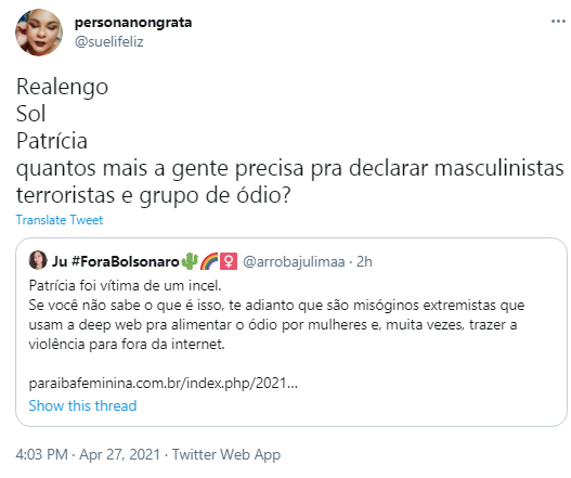 O post “PATRICIA, 22 ANOS, MORTA POR UM MASCU?” foi publicado em 27th April 2021 e pode ser visto originalmente na fonte Escreva Lola Escreva