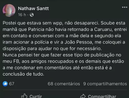 Sem se apresentar à polícia, Jonathan escreveu em suas redes sociais: “Postei que estava sem wpp, não desapareci. Soube esta manhã que Patricia não havia retornado a Caruaru, entrei em contato e conversei com a mãe dela e segundo ela iram [sic] acionar a polícia e vir a João Pessoa, me coloquei a disposição para ajudar no que for necessário. Nunca pensei ter que fazer esse tipo de publicação no meu FB, aos amigos reocupados [sic] e os demais que estão a me condenar em comentários até então está [sic] é a conclusão de tudo”.