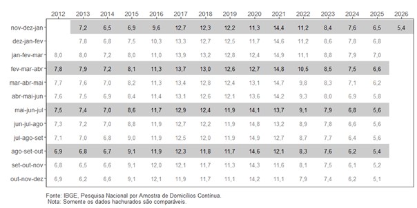 | Indicador/Período | Nov-dez-jan 2026 | Ago-set-out 2025 | Nov-dez-jan 2025 |