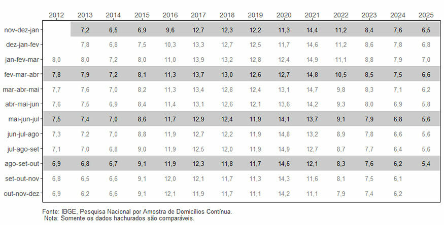 A taxa de desocupação (5,4%) no trimestre encerrado em outubro de 2025 foi a menor da série histórica iniciada em 2012, recuando nas duas comparações: -0,2 ponto percentual (p.p.) frente ao trimestre móvel anterior (5,6%) e -0,7 p.p. ante o mesmo trimestre móvel de 2024 (6,2%).