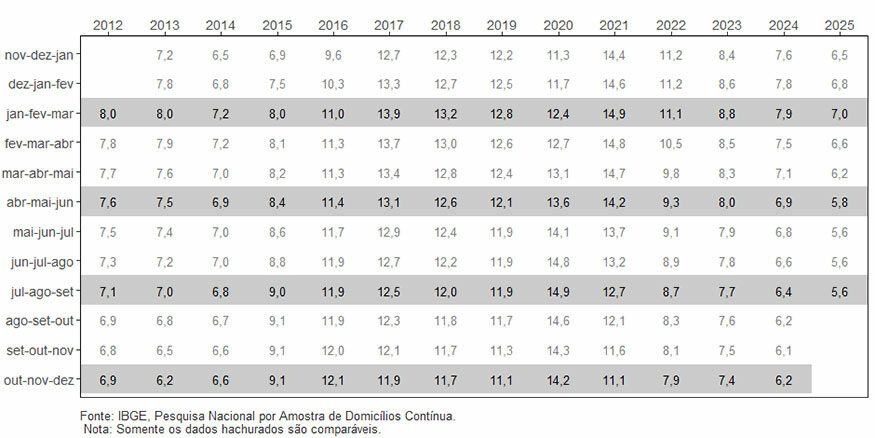 A taxa de desocupação (5,6%) no trimestre encerrado em setembro de 2025 repetiu a menor da série histórica iniciada em 2012, recuando nas duas comparações: -0,2 ponto percentual (p.p.) frente ao trimestre móvel anterior (5,8%) e -0,8 p.p. ante o mesmo trimestre móvel de 2024 (6,4%).
