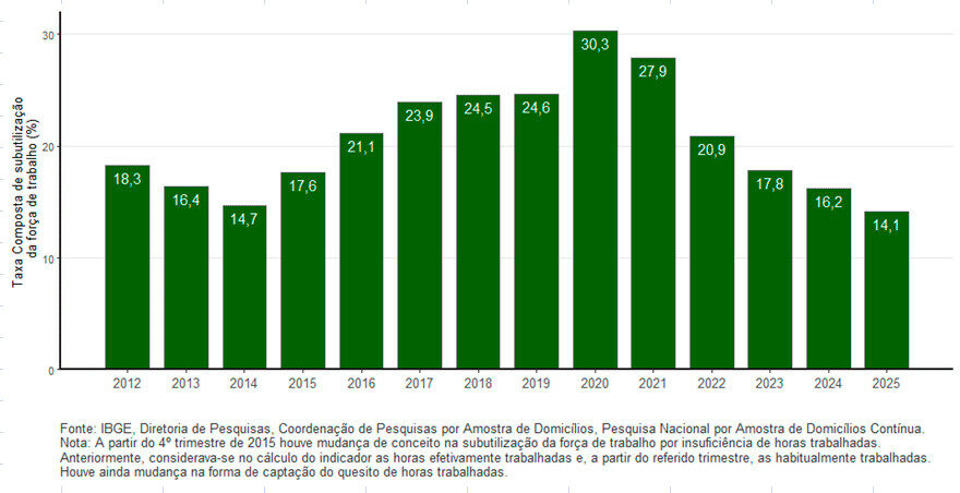 A taxa composta de subutilização (14,1%) foi a mais baixa da série, recuando nas duas comparações: -1,3 p.p. frente ao trimestre anterior (15,4%) e – 2,1 p.p. ante o mesmo trimestre de 2024 (16,2%). A população subutilizada (16,1 milhões) caiu nas duas comparações: -8,8% (menos 1,6 milhão) no trimestre e -12,4% (menos 2,3 milhões) no ano.
