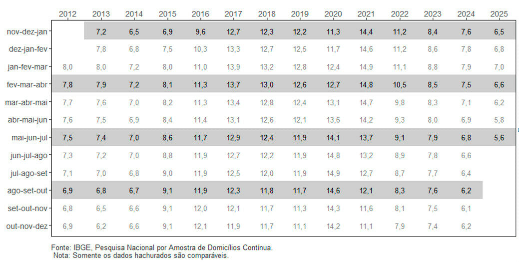 A taxa de desocupação (5,6%) no trimestre encerrado em julho de 2025 foi a menor da série histórica iniciada em 2012, recuando nas duas comparações: -1,0 ponto percentual (p.p.) frente ao trimestre móvel anterior (6,6%) e -1,2 p.p. ante o mesmo trimestre móvel de 2024 (6,9%).
